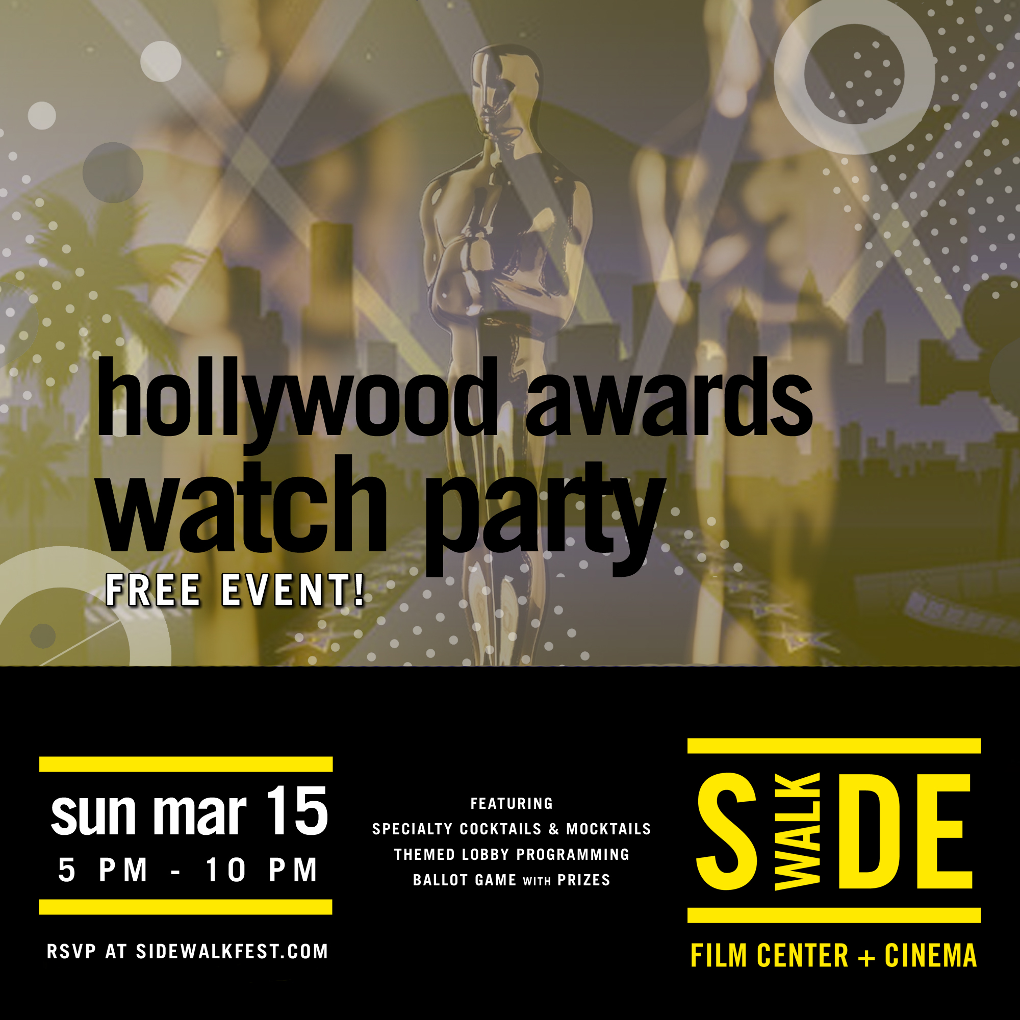 - Join us to celebrate Hollywood's most celebrated evening with a FREE watch party. We'll have a live stream of the awards ceremony on the big theatre screen and all three screens in our lobby bar! We'll get started at 5:00pm with the Red Carpet Experience followed by the awards program at 6:00pm. Enjoy champagne and concessions specials and cheer on your favorite nominees with fellow cinephiles! Swing by the cinema and grab a ballot from the Box Office to fill out to get entered to win a $1,000 cinema membership + a deluxe swag bag. Ballots must be turned in by 6pm on March 15th to qualify. *This is a free event. Reservations are strongly recommended but not required. Seating is first come, first served*